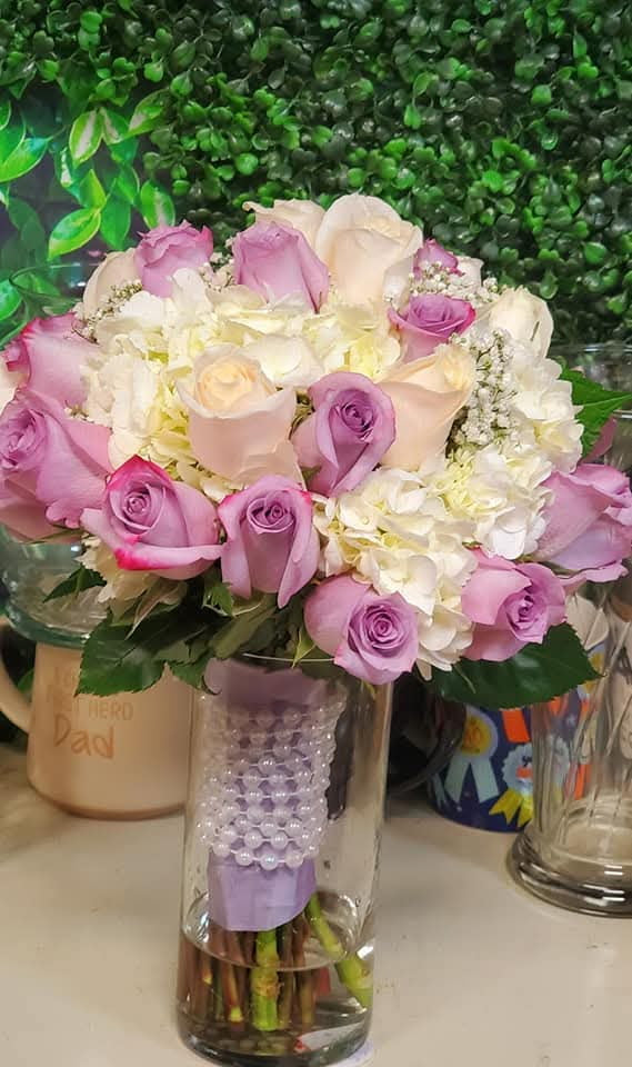 Celebrate love and elegance with our Lavender Grace Floral Ensemble, a captivating mix of soft lavender and peach roses paired with lush white hydrangeas, accented with delicate baby's breath. Encased in a chic glass vase adorned with pearl detailing, this bouquet adds a touch of whimsy and sophistication to weddings, anniversaries, or any special occasion. Order now to bring this stunning creation to life!