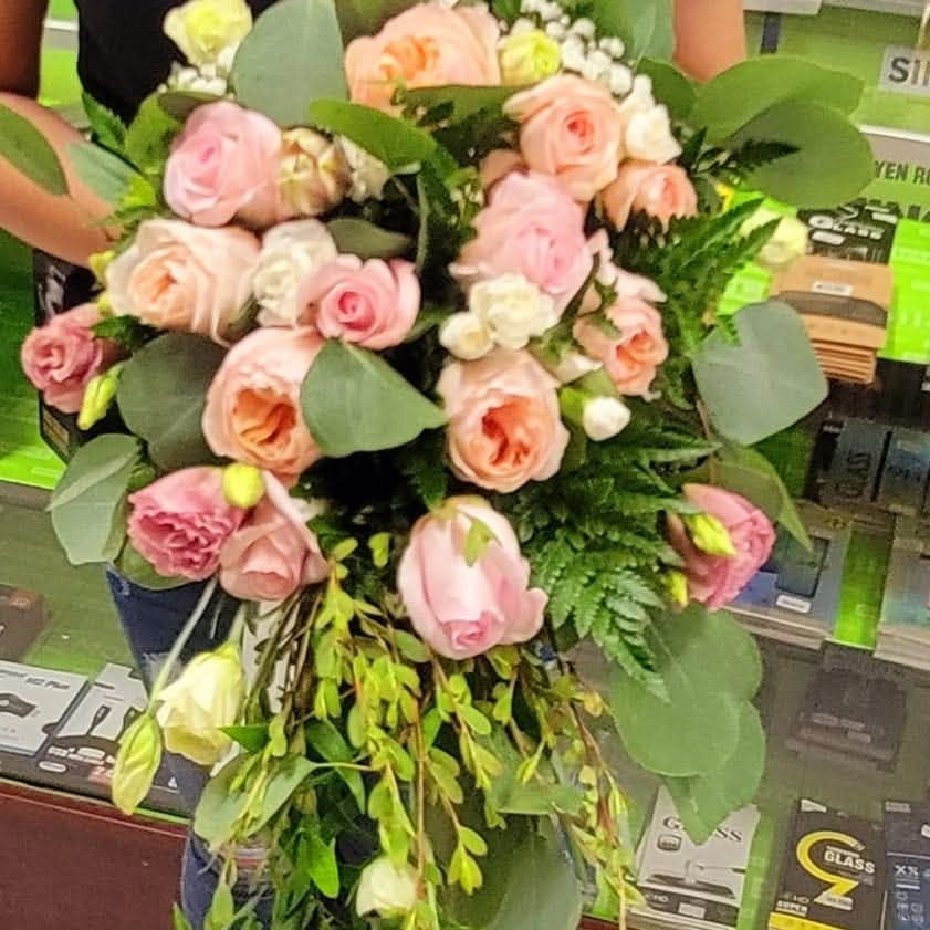 Indulge in timeless elegance with this cascading bridal bouquet, featuring lush peach and ivory roses, accented with delicate greenery and baby's breath, crafted to make your special day unforgettable—perfect for the ultimate romantic statement!