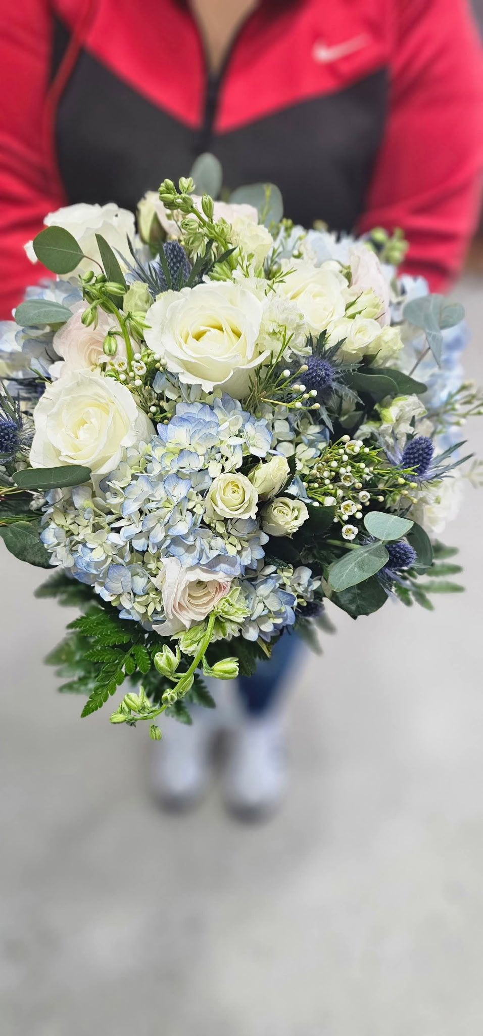 Indulge in timeless elegance with this cascading bridal bouquet, featuring soft blue hydrangeas, pristine white roses, and delicate accents, crafted to make your special day unforgettable—perfect for the ultimate romantic statement!